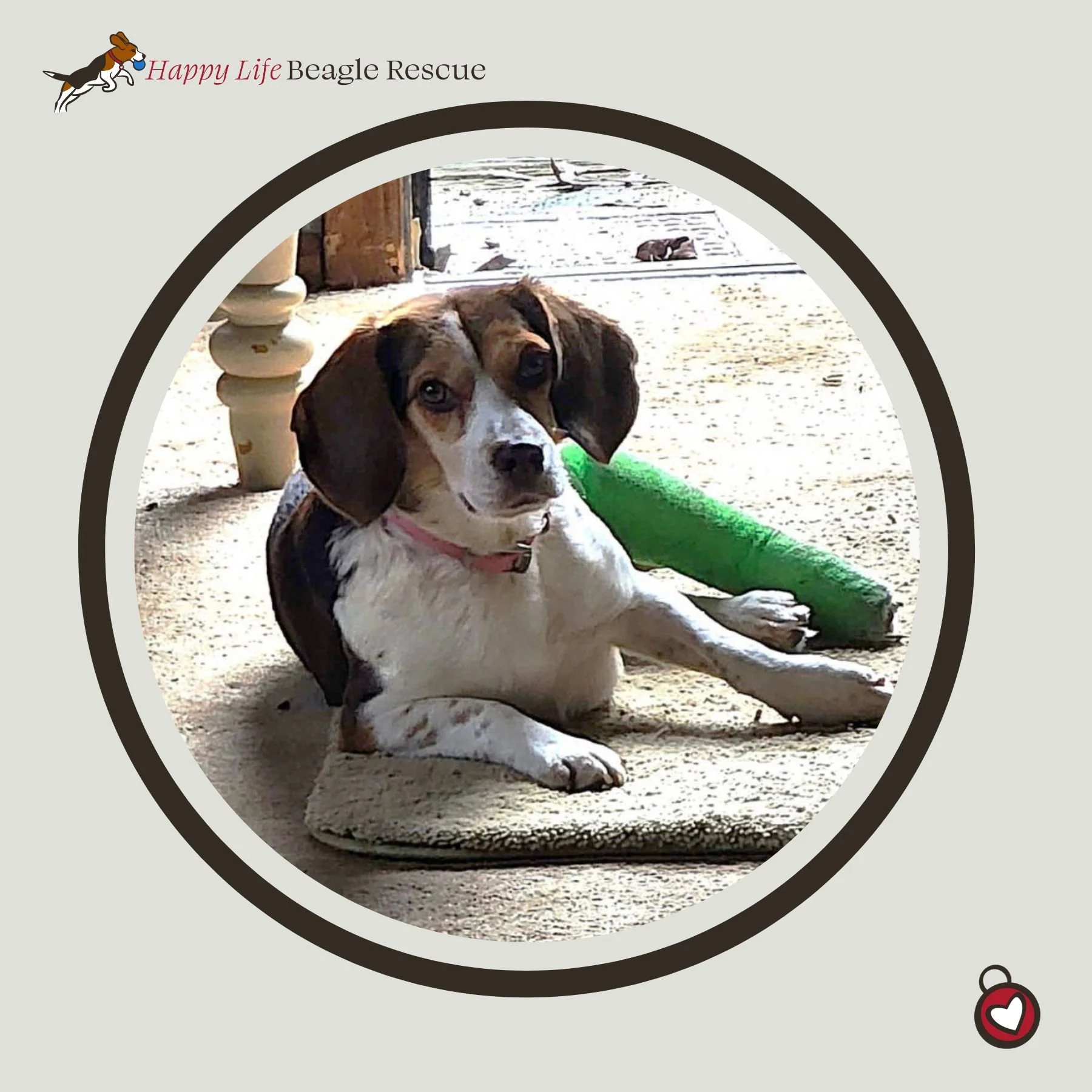 Eileen in new to the rescue. We were contacted by a southern shelter with the following information, “Meet Eileen. The sweet little beagle was found injured along the side of a rural road. After a stay with the vet and the love of a foster mom, Eileen has fully recovered. She is very sweet and loves to cuddle. Even when she had her cast, she had lots of energy. She is housetrained. Eileen gets along with other dogs, and we do not know what she thinks of cats. She is now fully healed up and ready to live out the rest of her life as part of a loving family. Please help this sweet girl find her forever home.”